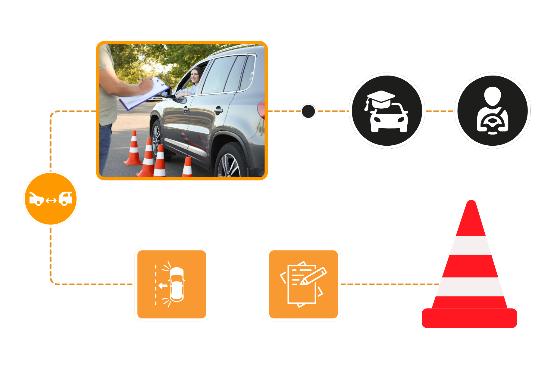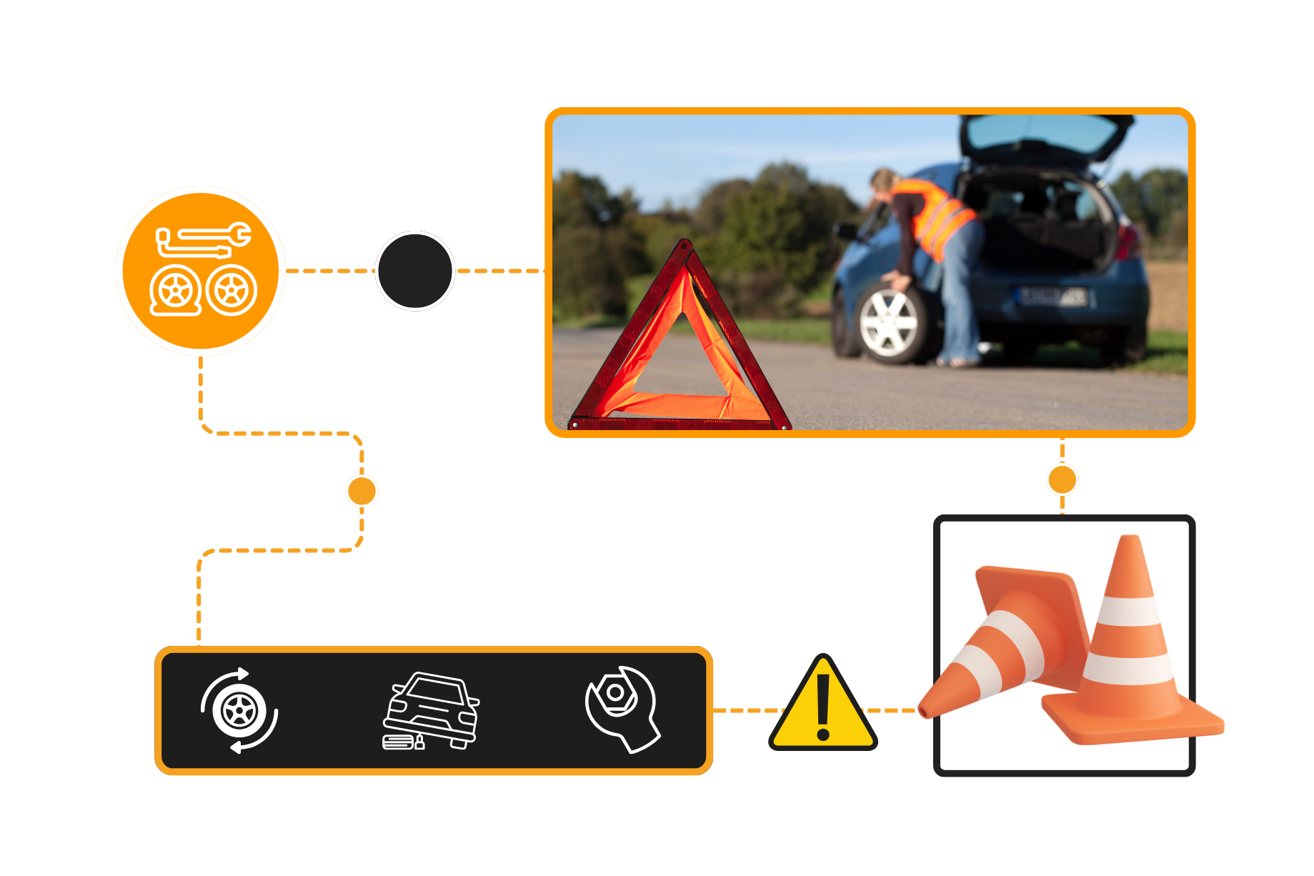 Si estás en la carretera o en una vía muy transitada al momento de poncharte, toma las medidas de precaución adecuadas. En los cursos de manejo de Escuela Drive, señalamos a los estudiantes que deben tener un triángulo de seguridad o conos en sus vehículos para indicar a otros carros de manera efectiva que tienes un problema con tu vehículo.